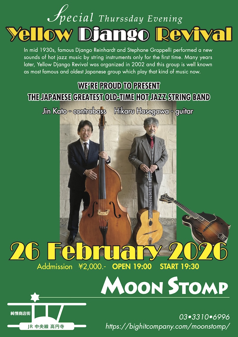 ライブ会場は、この20年余り、ルーツ・ミュージック中心にライブ営業されている、高円寺のムーンストンプがライブ会場です。若くて活きの良いジプシージャズ・バンドがたまに出演されるようですが、僕らは、Djangoが現役で演奏したトラッドジャズの時代を彷彿とさせる古臭い演奏でご機嫌を伺います。