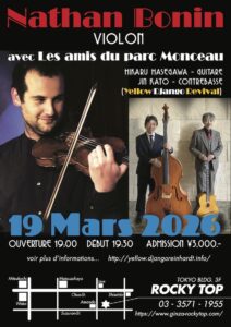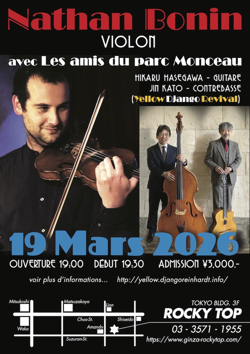 長谷川が15年前に、パリのモンソー公園で初めて会って一緒にセッションした、素晴らしいジャズバイオリニストNathan Boninくんと、3年ぶりの再演が叶いました。国内現役最古参のジプシージャズバンドYellow Django Revivalから長谷川と加藤が共演します。これはファンの皆さんも楽しみだと思います。